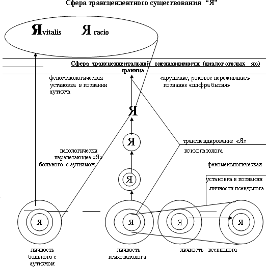 душой и интуицией испытывают так называемое «чувство шизофрении», многажды критикуемое объективной психиатрией, именно при встрече аутичного больного. Что чувствует при этом психопатолог? В третий раз, при размышлениях о феноменологии, врач-психопатолог попробует совершить транцензус своей собственной души и своего «Я». Как и следовало ожидать, «Я» психопатолога, даже после трансцендирования, уже пережив ясперсовское роковое переживание, очистившись от одежд социального, профессионального, семейного окружения, будучи готовым к восприятию другого «голого Я», сможет убедиться только в недостижимости «Я» больного, одетого в броню аутизма. Психопатолог очень близко приблизится к границе существования «вещей самих по себе», как сквозь прозрачный стеклянный футляр, он сможет наблюдать перелетевшее в инобытие «Я» больного. При этом, «Я» аутиста окажется в трансцендентном пространстве, в инобытии всеми своими частями, и рационально мыслящей частью и витальной, жизненной, чувствущей частью. Ничто не тянет его назад к людям, он там, в ином мире, холодном и чуждом нам. И мы не в состоянии сердцем сопережить и вчувствоваться в его охладевшее «Я». Инакость, инопланетарность, чуждость аутиста и есть та «лакуна», которая при познании феномена аутизма ставила в «тупик» и Ясперса, и всех нас, и сотни психиатров до и после него. Психопатолога касается холодное дыхание вечности, ему зябко рядом с неживым «Я» больного, врача будто обжигает дыхание Снежной королевы, ещё чуть-чуть и сердце кольнёт маленький осколок зеркала Снежной королевы. Это, наверное, и есть «чувство шизофрении». Утешением нашему врачебному оптимизму должны служить факты возвращения «Я» больного с аутизмом назад к людям. Предсмертные ремиссии при шизофрении, в том числе после многих десятилетий глубокого аутизма, с апато-абулическим дефектом, с тяжелыми хроническими ступорозными статусами, говорят о принципиальной возможности обратного «перелёта» «Я» больного. Десятками лет молчащие больные, застывшие в эмбриональных позах или бормочущем слабоумии, вдруг, в течение нескольких дней рассказывают врачам длительные истории своей больной жизни, вспоминая в деталях бытовые подробности очень земной, такой грешной и обыденной нашей больничной жизни. Мы попытались осуществить три попытки осмыслить некоторые феномены больной душевной жизни, с помощью феноменологической установки. Осталось, под конец, только расставить акценты в осмышлении понятий целостности и аналитического разложения предмета исследования. Несмотря на полемический запал в осуждении механистического способа познания, мы понимаем, что феномен человека, даже в виде отдельных проявлений его душевной жизни, в целостном виде нами не может быть осознан, как не может быть изучено в целом и то, что Ясперс именовал «объемлющим». Диалектичность эпистемологического подхода в познании феноменов больной душевной жизни, наверное, и должна заключаться в стремлении приблизиться, как можно ближе, к «относительным целостностям», понимая при этом, бесконечность самого процесса познания феноменов душевной жизни человека. Невозможно обойтись без анализа, расщепления, разложения сложного феномена, сложного синдрома больной душевной жизни на составляющие его элементы. Но каждый раз, в ходе такого анализа, мы дол