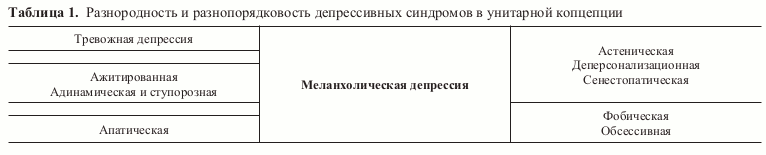 Таблица 1. Разнородность и разнопорядковость депрессивных синдромов в унитарной копцепции