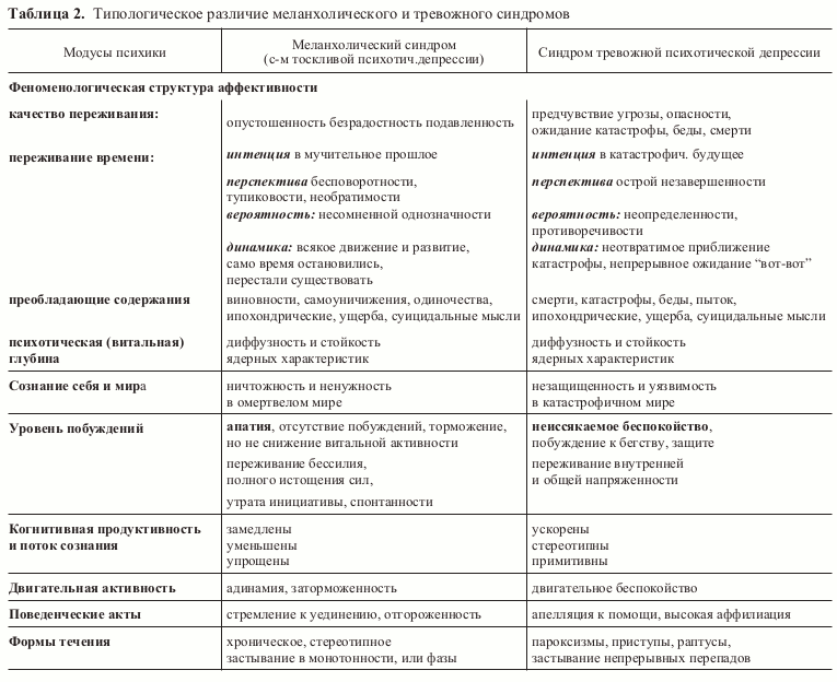 Таблица 2. Типологическое различие меланхолического и тревожного синдромов