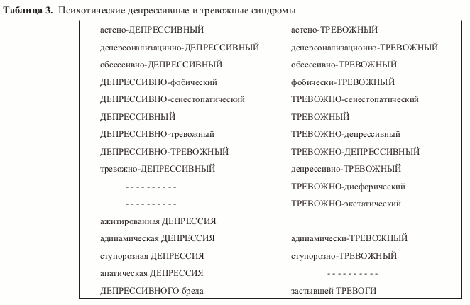 Важно зафиксировать структуру тревожно-депрессивных состояний написанием аффекта психотической глубины заглавными буквами и начиная с того, который определяет клиническую картину состояния. Например, тревожно-ДЕПРЕССИВНЫЙ или ДЕПРЕССИВНО-тревожный и т.п. (табл. 3).