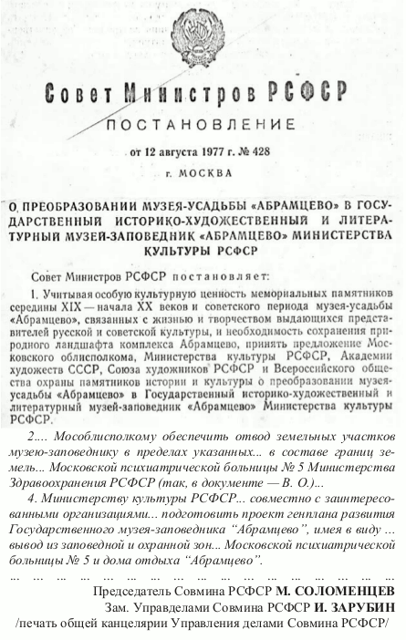 - Но, к несчастью, вопрос о переводе больницы снова возник, когда убили, кажется, кого-то из родственников Кукрыниксов …. Решили больницу перевести за Загорск (теперь, Сергиев Посад). Там место уже определили, но денег не дали, и больница осталась на месте, а Постановление Правительства – на бумаге. Публикуется впервые (прим. Автора).